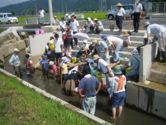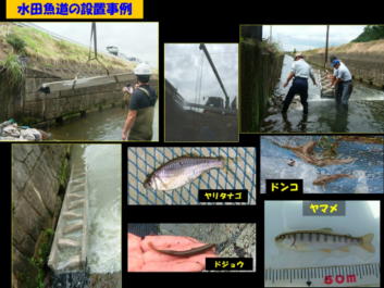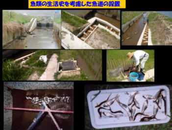 「水田魚道」とは魚類が圃場へ自由に出入りできるように、水田と主に農業用排水路との間に取り付けた 「魚の階段」です。ドジョウやフナ、メダカなどは、春になると水田から排水路に流れ出た暖かい水に誘われ て大群となって水田委遡上し浅い水辺で産卵します。餌となるプランクトンが多く、また流れが緩やかなた め卵や稚魚が流されません。そのため、水田は魚類が産卵するのに最適な「ゆりかご」となっています。